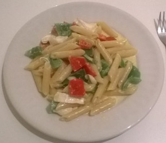 - Laissez confire les poivrons et lorsqu'ils sont bien fondants, ajoutez les pâtes, la crème fraîche et le fromage de chèvre, mélangez sur le feu pendant 2 minutes environ avant de servir